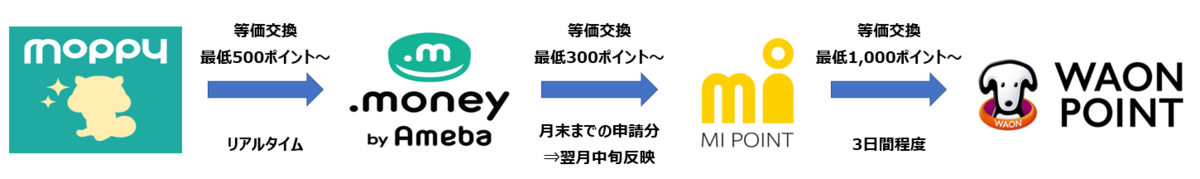 ・モッピー ⇒ .money(ドットマネー) ⇒ エムアイポイント ⇒ WAON POINT